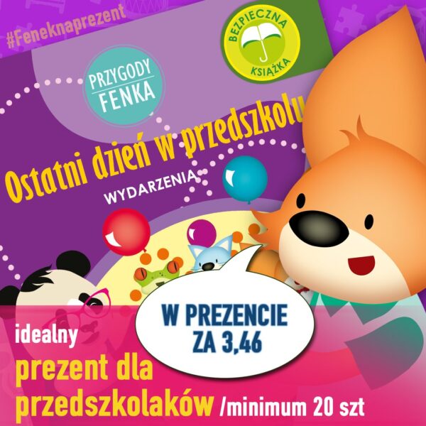 Wyjątkowa oferta dla przedszkoli, szkół, bibliotek. Chcecie sprawić dzieciom prezent zakończenie przedszkola? Dołożymy się do prezentu! Kup co najmniej 20 książek Przygody Fenka  „Ostatni dzień w przedszkolu”, a dostaniesz je po  6,8 zł/sztukę